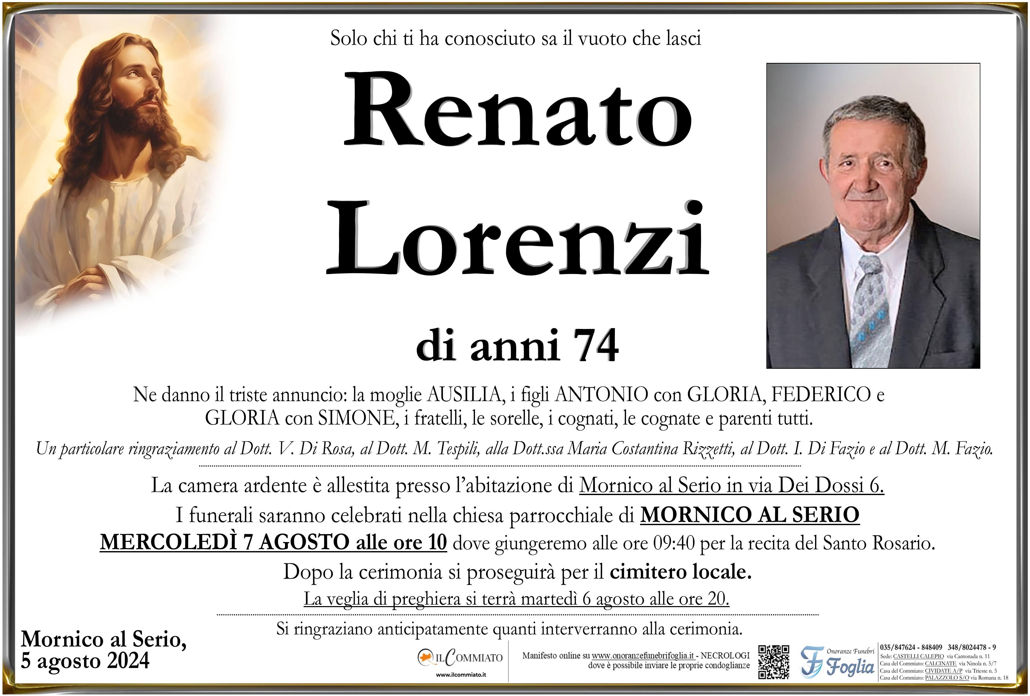 La camera ardente è allestita presso l’abitazione di Mornico al Serio in via Dei Dossi 6.