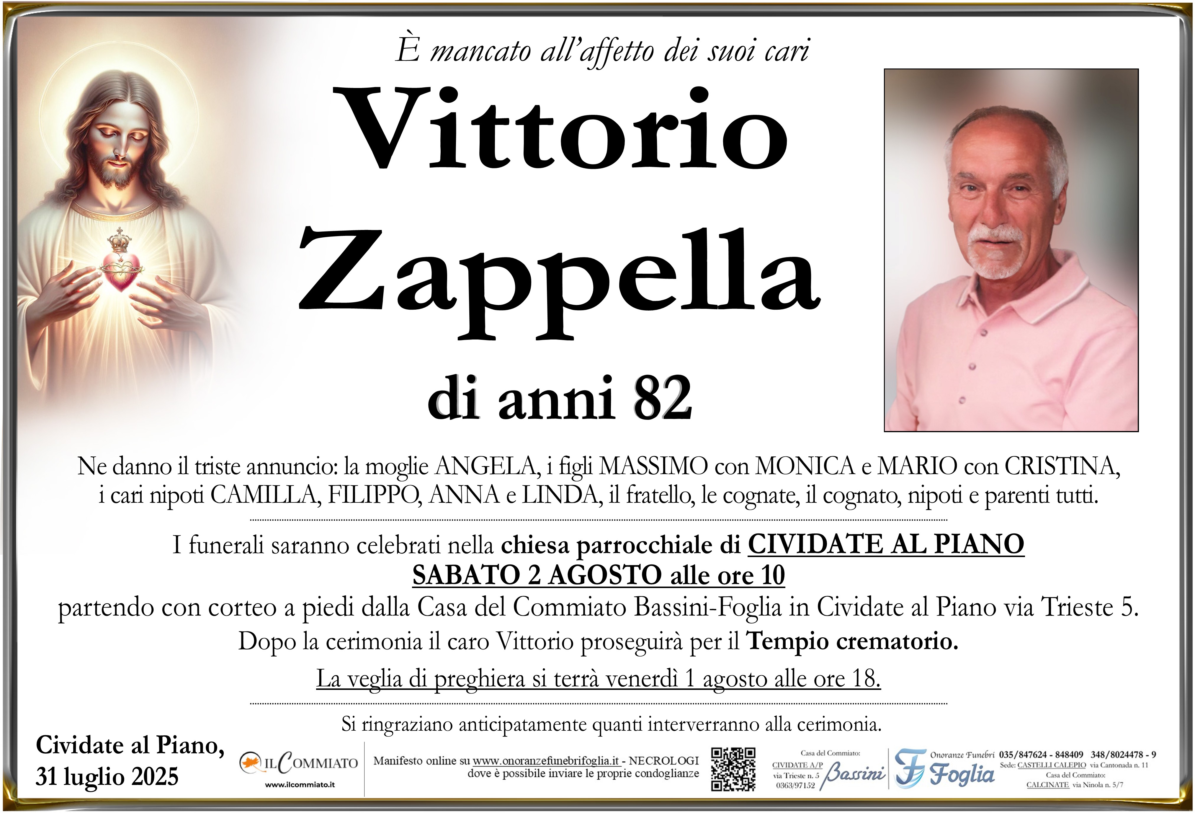 Dopo la cerimonia il caro Vittorio proseguirà per il Tempio crematorio.