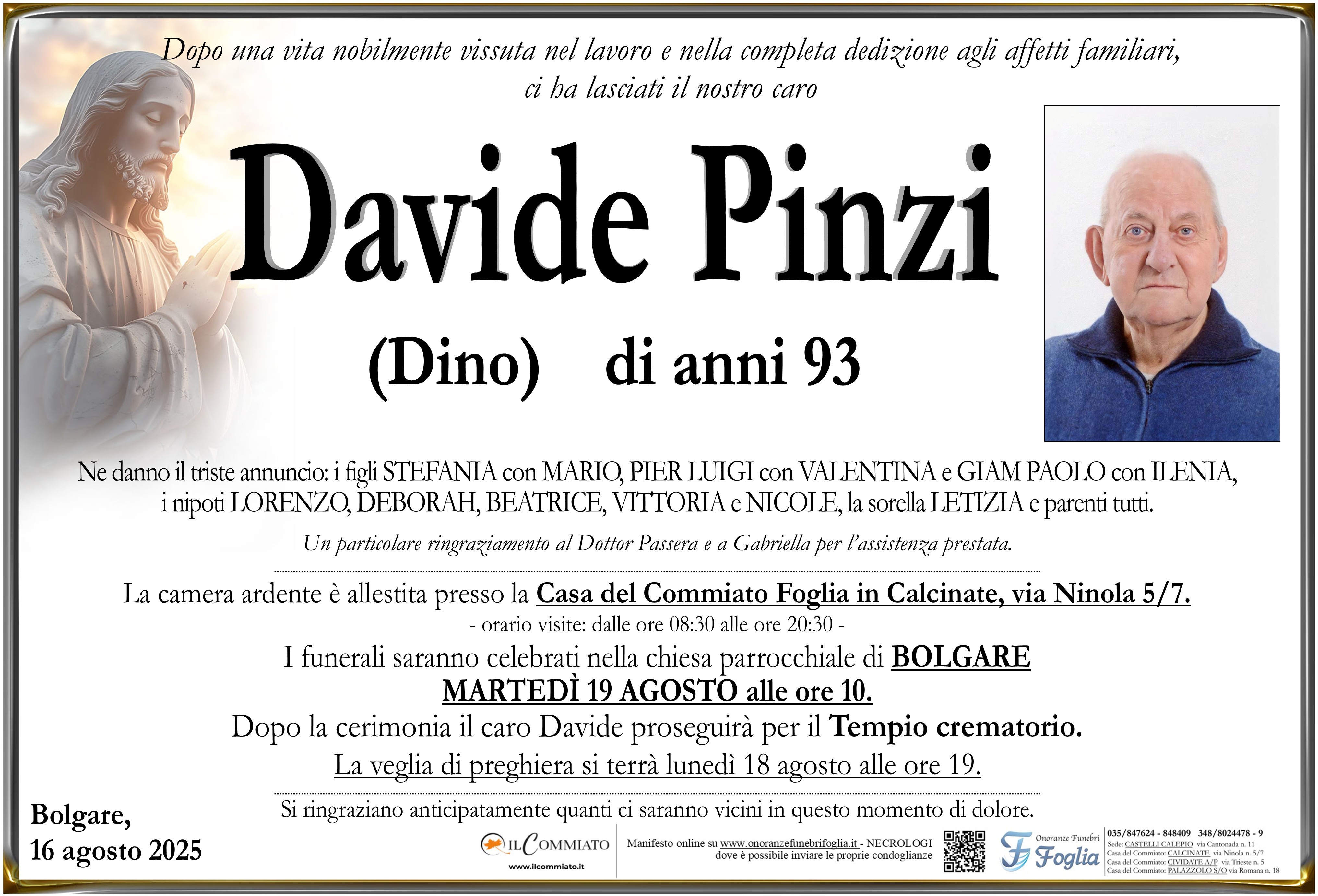 I funerali saranno celebrati nella chiesa parrocchiale di BOLGARE MARTEDÌ 19 AGOSTO alle ore 10.