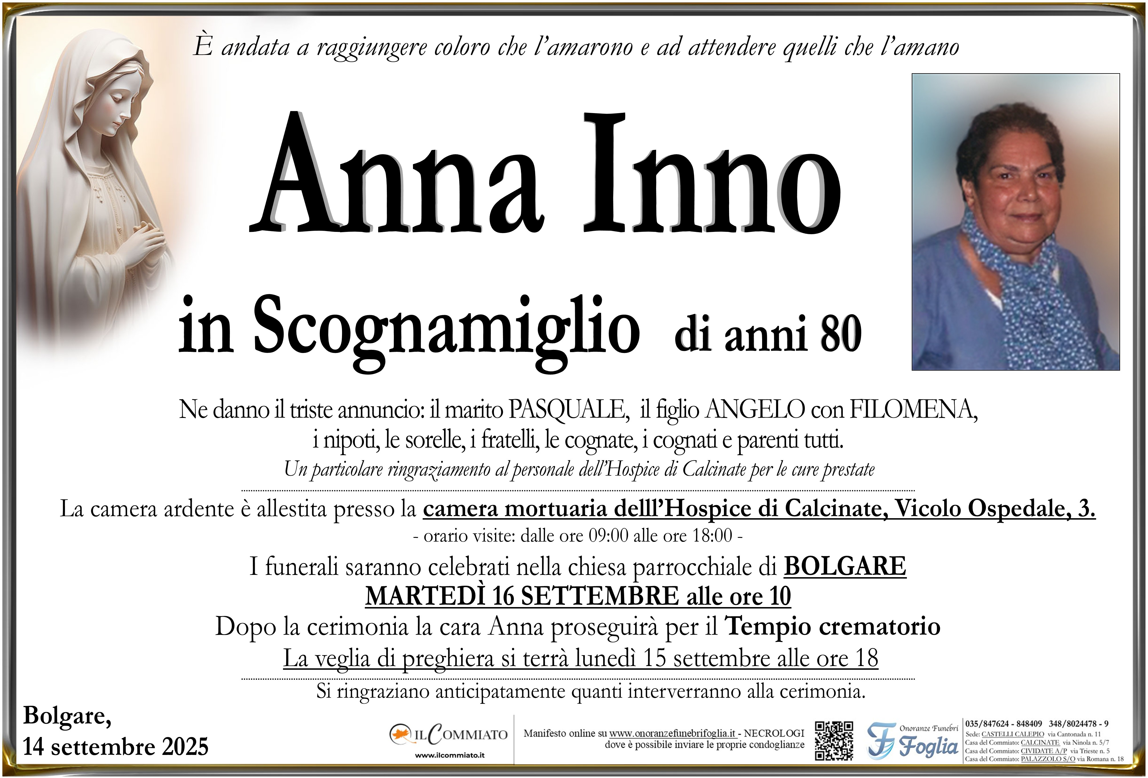 I funerali saranno celebrati nella chiesa parrocchiale di BOLGARE MARTEDÌ 16 SETTEMBRE alle ore 10