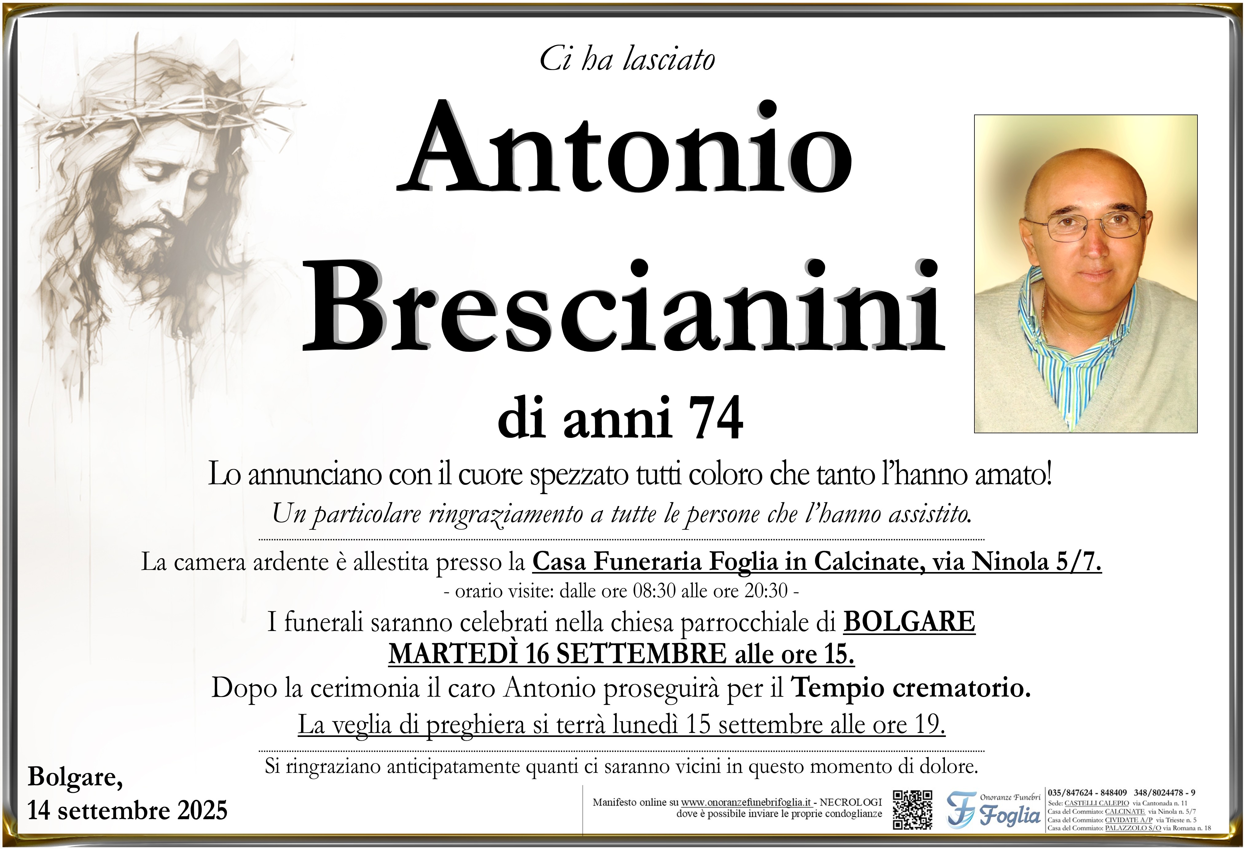 I funerali saranno celebrati nella chiesa parrocchiale di BOLGARE MARTEDÌ 16 SETTEMBRE alle ore 15.