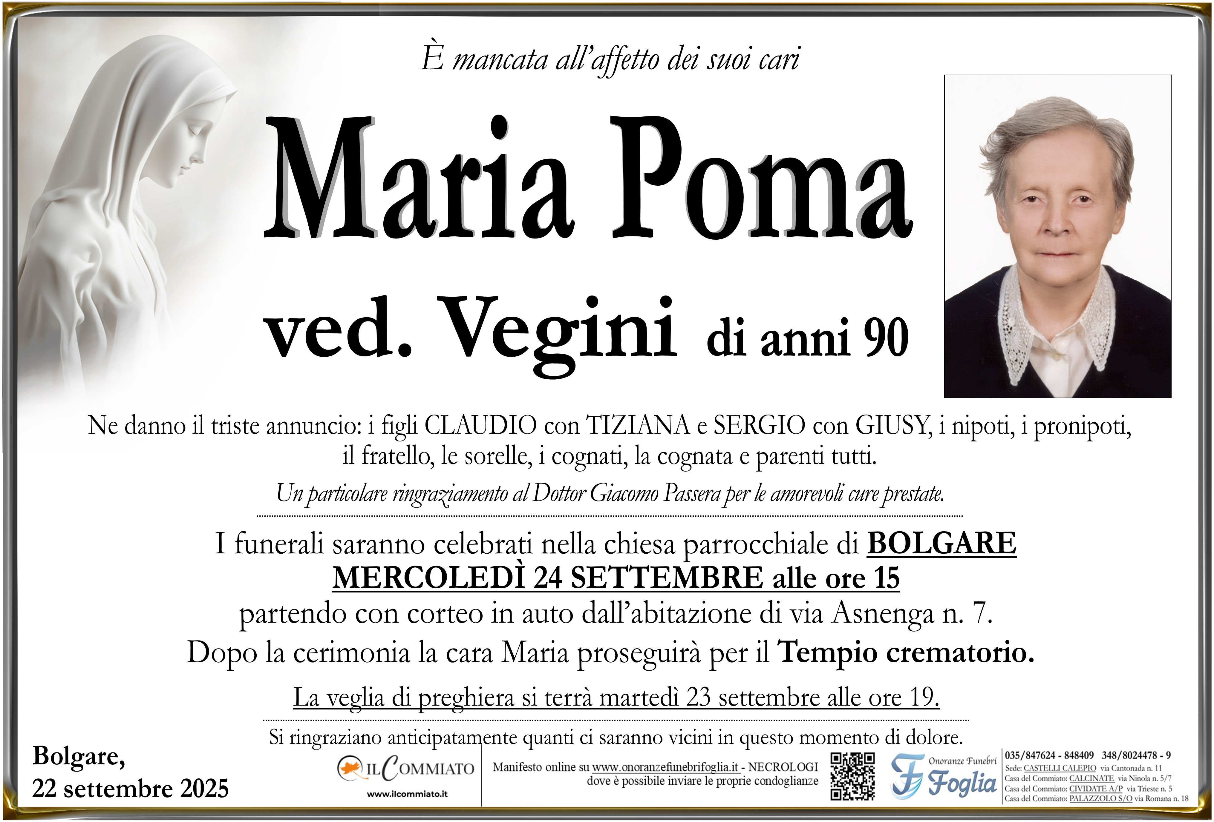 I funerali saranno celebrati nella chiesa parrocchiale di BOLGARE MERCOLEDÌ 24 SETTEMBRE alle ore 15