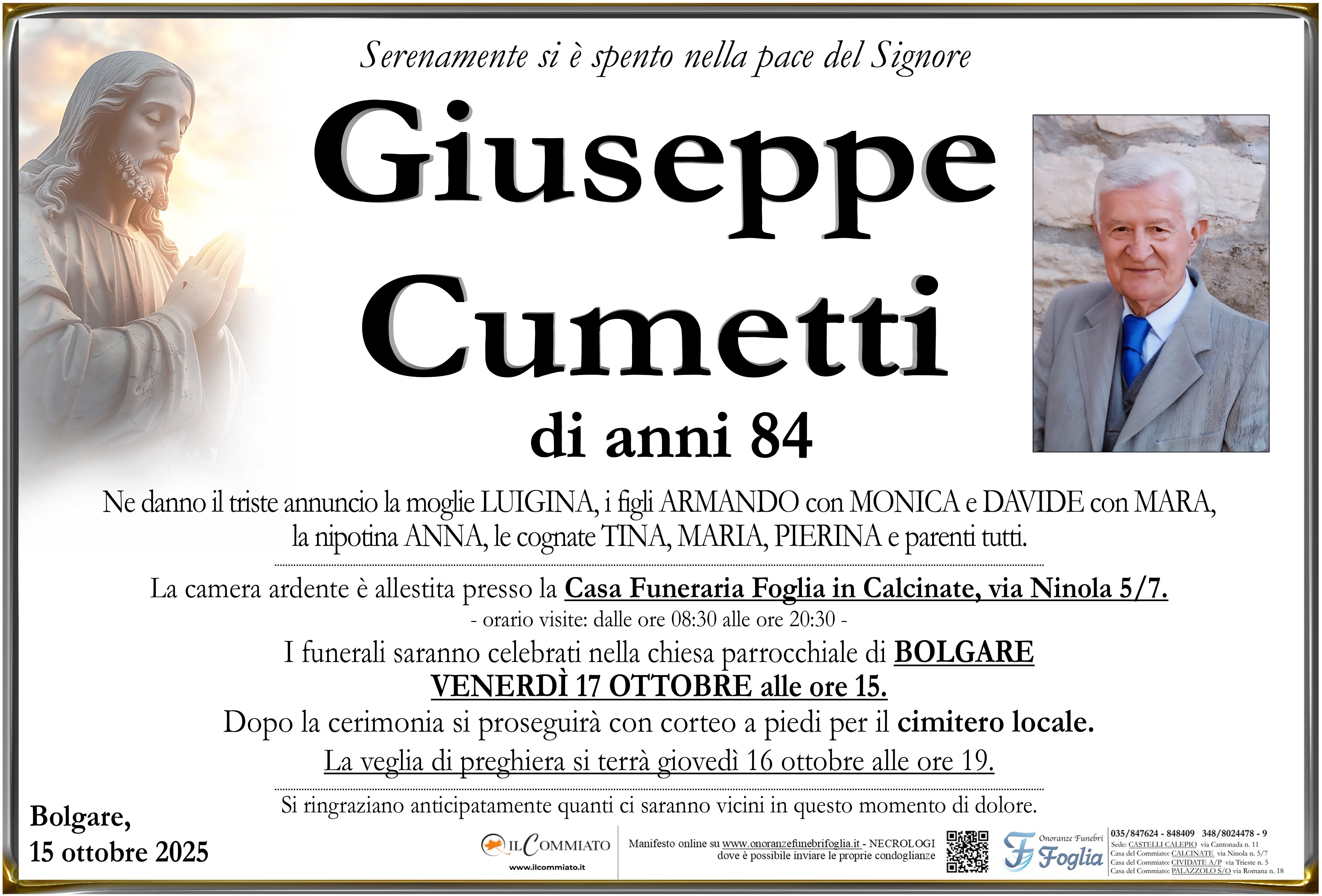 I funerali saranno celebrati nella chiesa parrocchiale di BOLGARE VENERDÌ 17 OTTOBRE alle ore 15.
