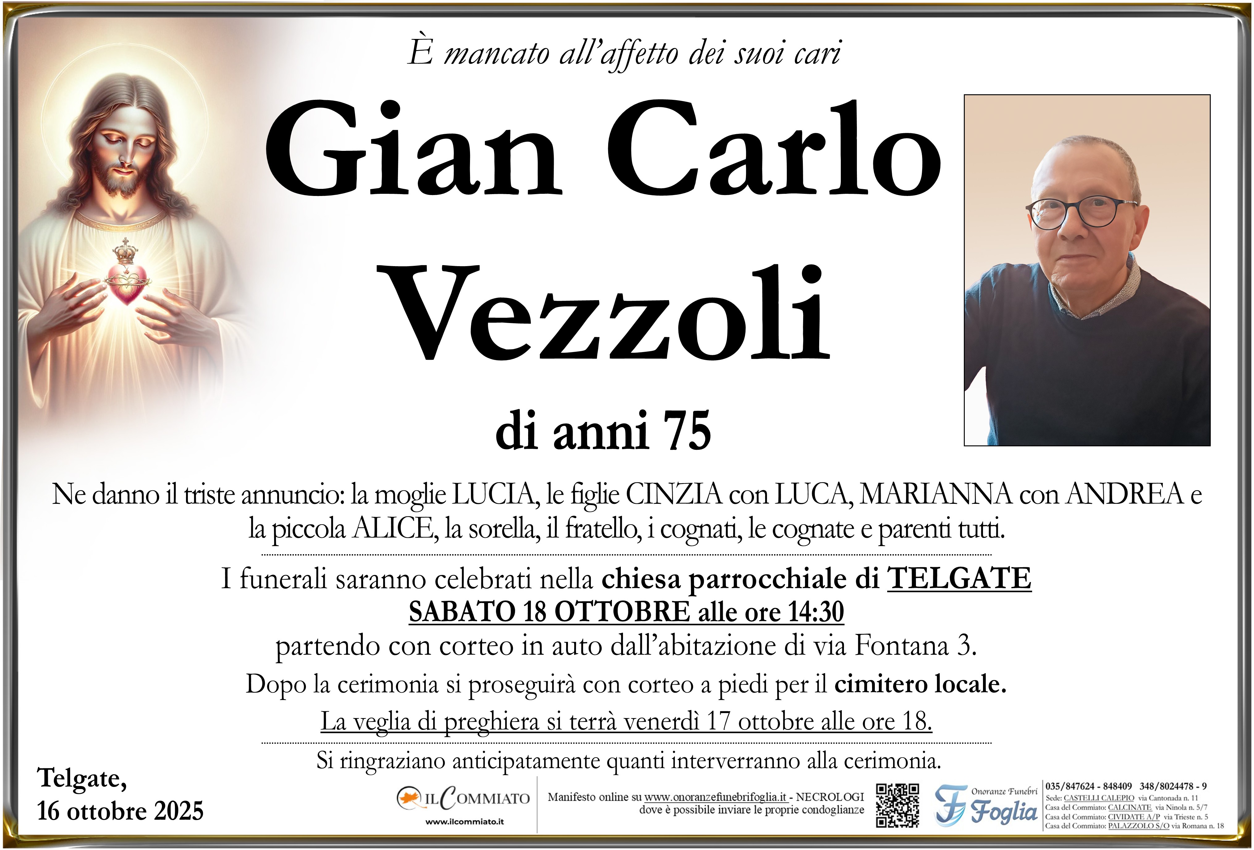 I funerali saranno celebrati nella chiesa parrocchiale di TELGATE SABATO 18 OTTOBRE alle ore 14:30 partendo con corteo in auto dall’abitazione di via Fontana 3.