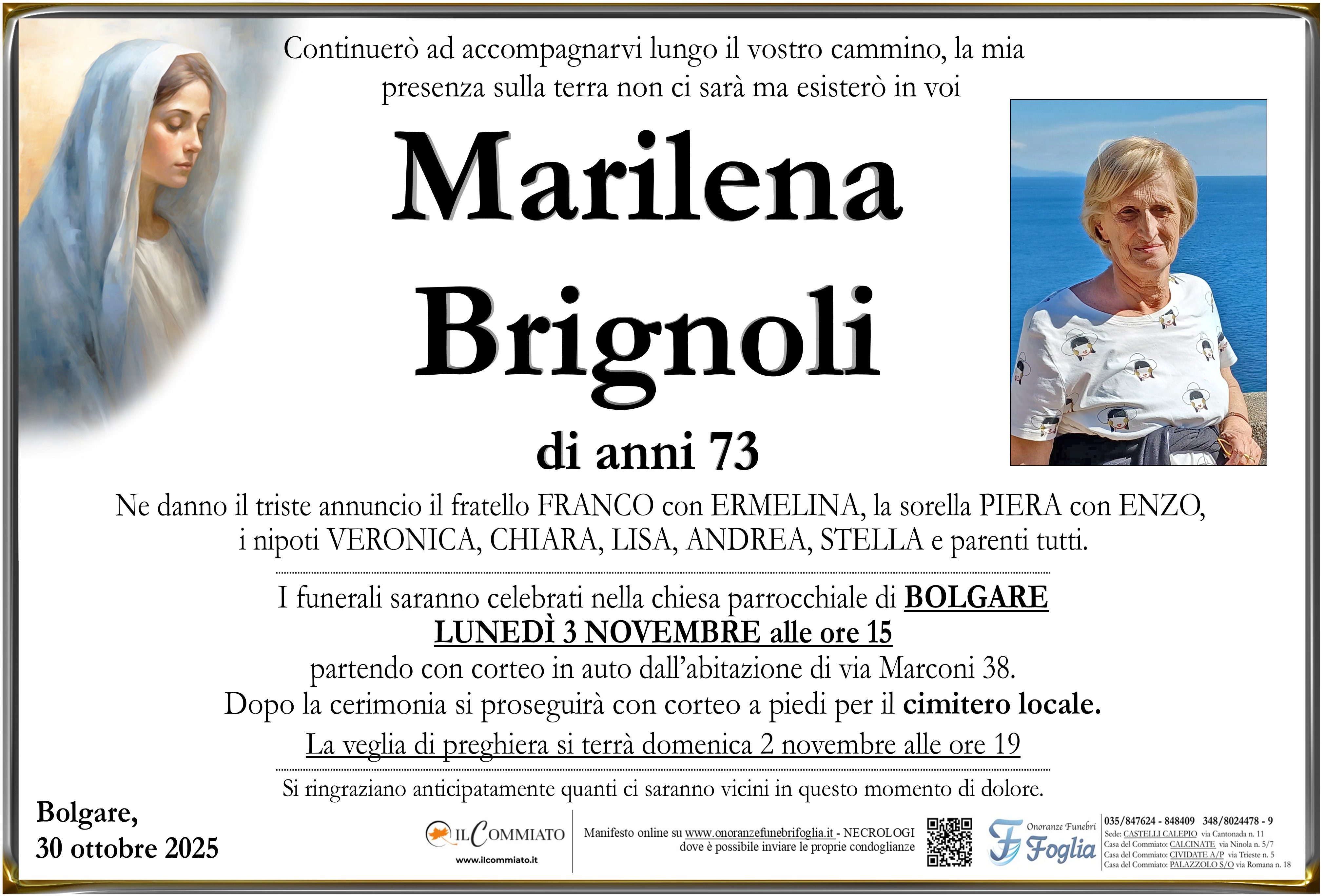 I funerali saranno celebrati nella chiesa parrocchiale di BOLGARE LUNEDÌ 3 NOVEMBRE alle ore 15