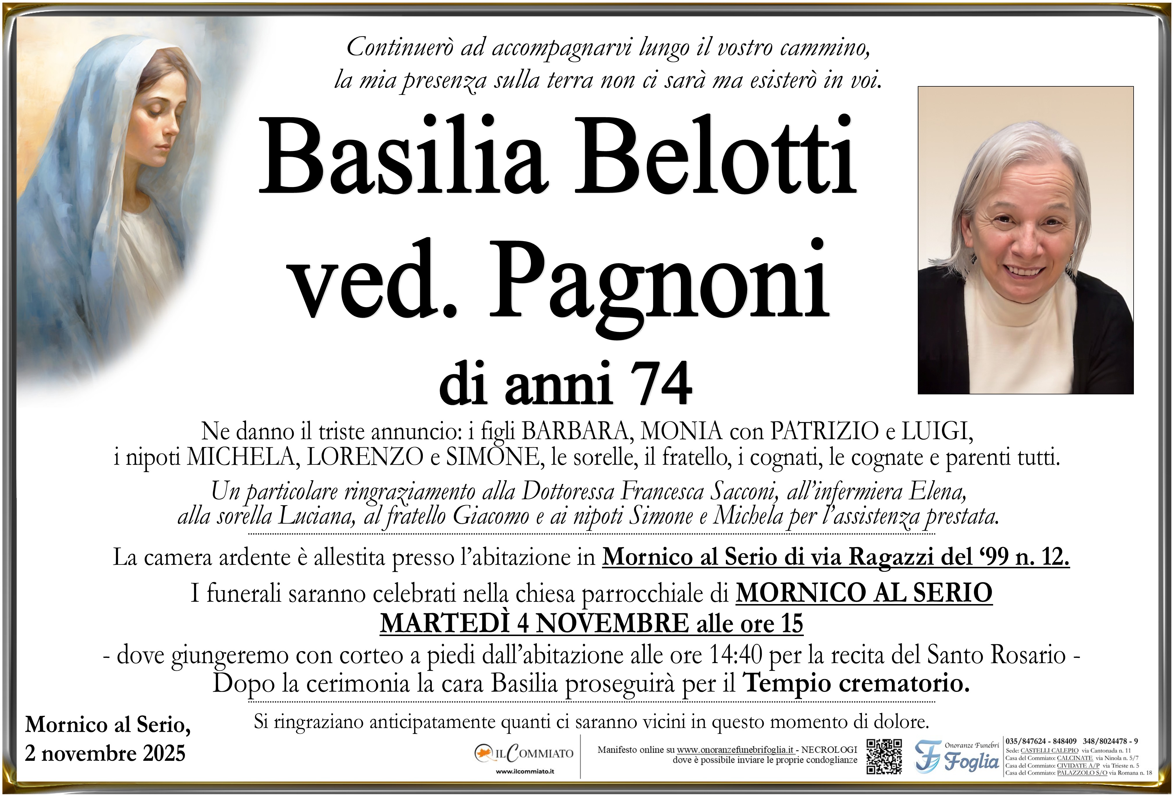 I funerali saranno celebrati nella chiesa parrocchiale di MORNICO AL SERIO MARTEDÌ 4 NOVEMBRE alle ore 15