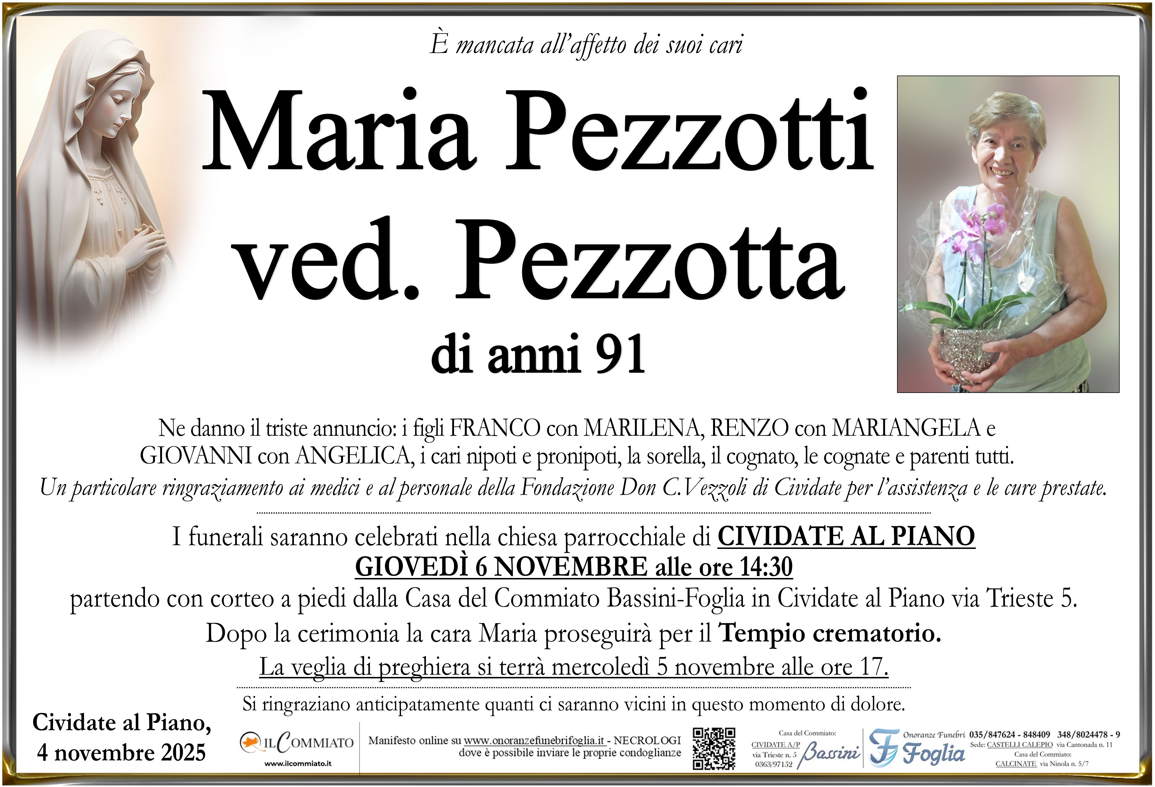 I funerali saranno celebrati nella chiesa parrocchiale di CIVIDATE AL PIANO GIOVEDÌ 6 NOVEMBRE alle ore 14:30