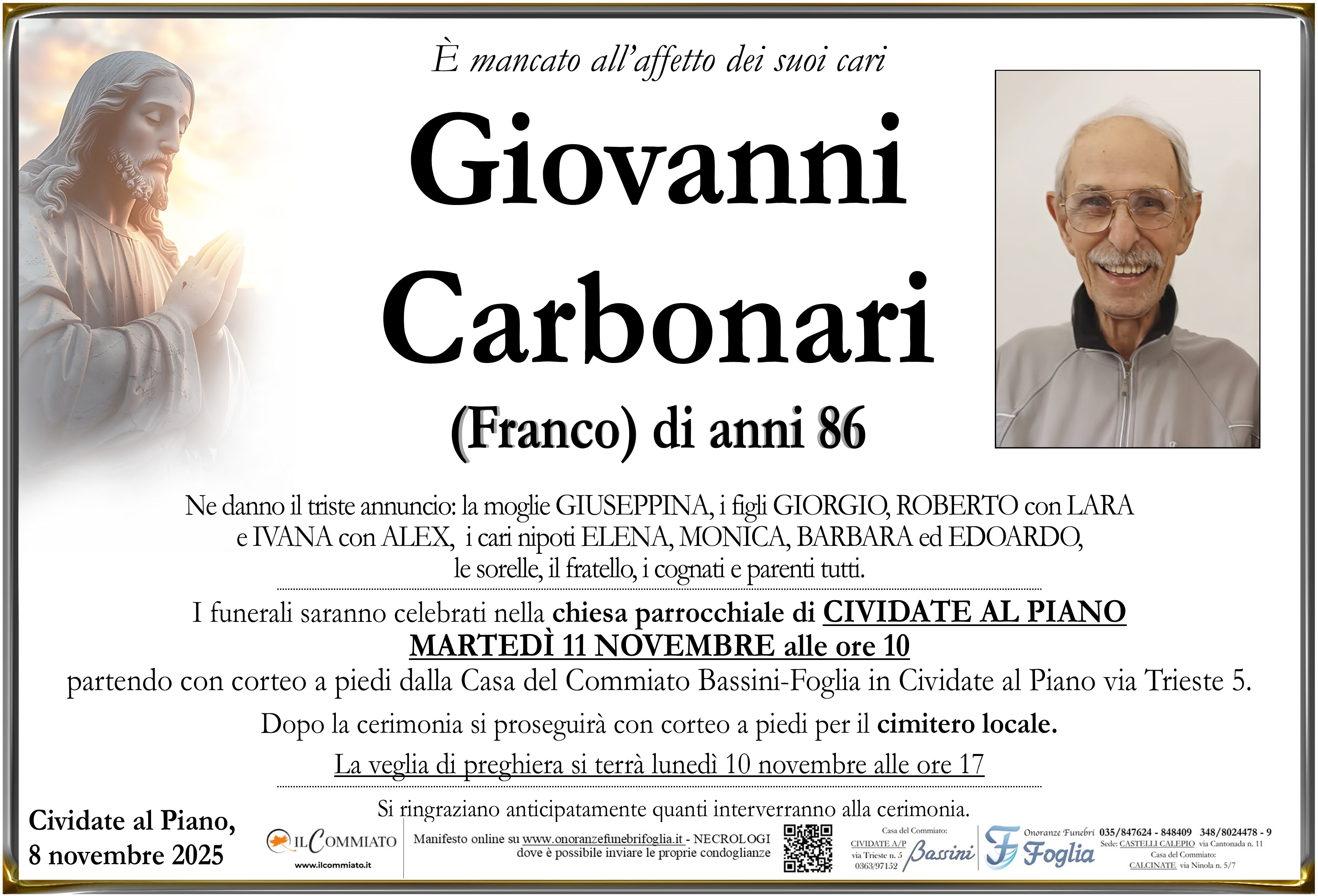 I funerali saranno celebrati nella chiesa parrocchiale di CIVIDATE AL PIANO MARTEDÌ 11 NOVEMBRE alle ore 10