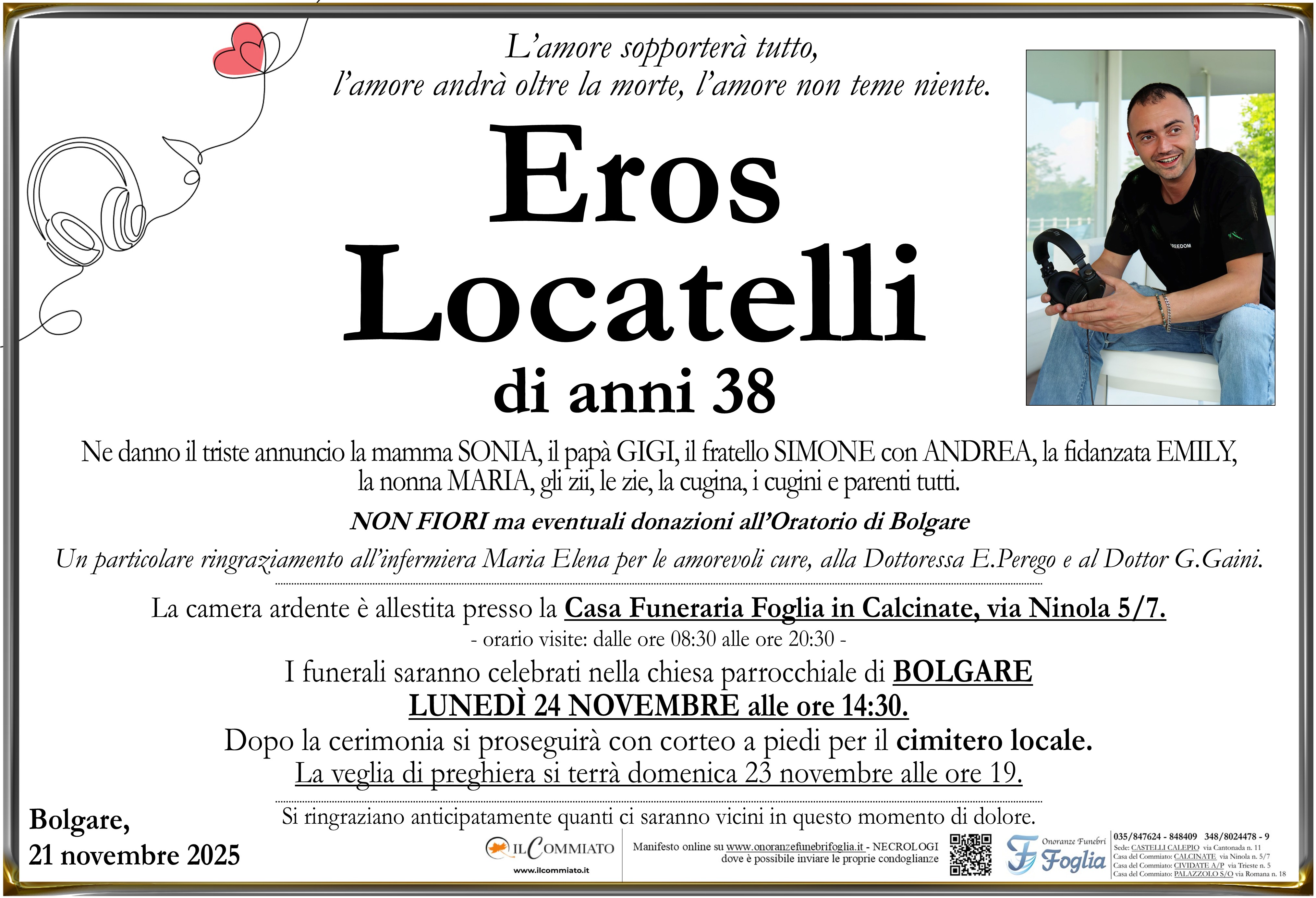 Ciao Eros, troppo presto hai lasciato questo mondo,ora farai ballare gli angeli,ti ricorderò con affetto.Condoglianze alla Famiglia.