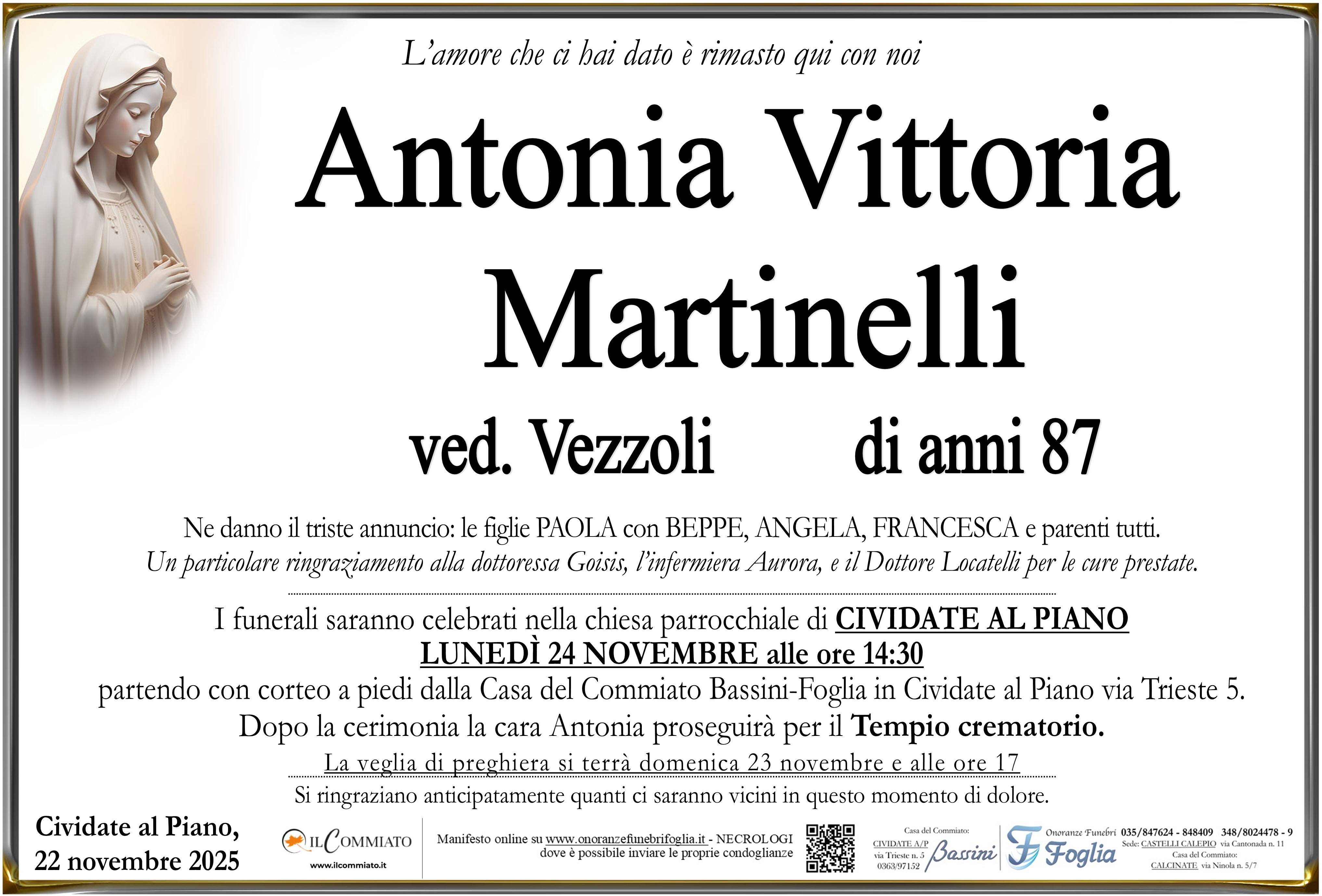 I funerali saranno celebrati nella chiesa parrocchiale di CIVIDATE AL PIANO
