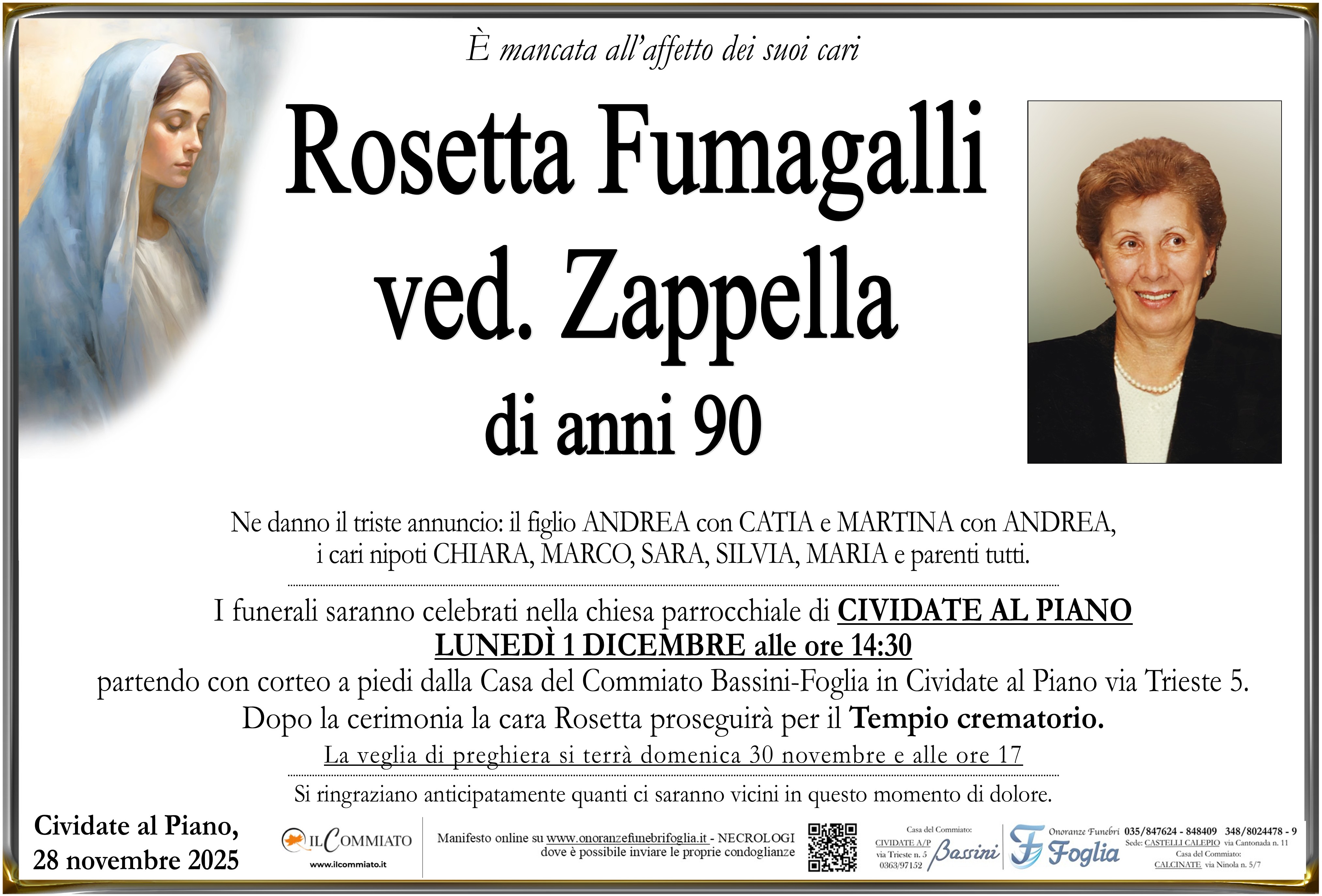 I funerali saranno celebrati nella chiesa parrocchiale di CIVIDATE AL PIANO LUNEDÌ 1 DICEMBRE alle ore 14:30